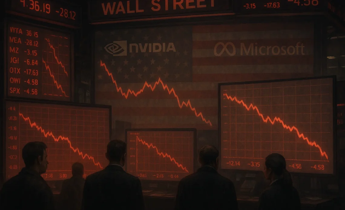 Nvidia fell over 7%, while Meta Platforms and Microsoft each lost about 4%, dragging all three major indexes into the red and snapping a three-week winning streak.